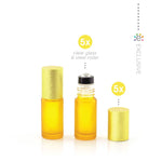 Zawartość: Zestaw to 5żółtych butelek z matowego szkła (efekt szronu) z nasadką z wysokiej jakości kulką ze stali nierdzewnej i metalową nakrętką.