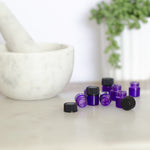 W zestawie: 1ml Fiolki z fioletowego szkła, końcówka z zakraplaczem i czarne nakrętki - 24 szt.