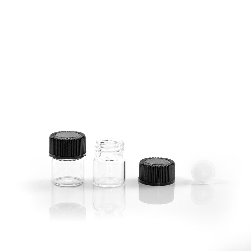 W zestawie: 1ml Fiolki z przezroczystego szkła, końcówka z zakraplaczem i czarne nakrętki - 24 szt.