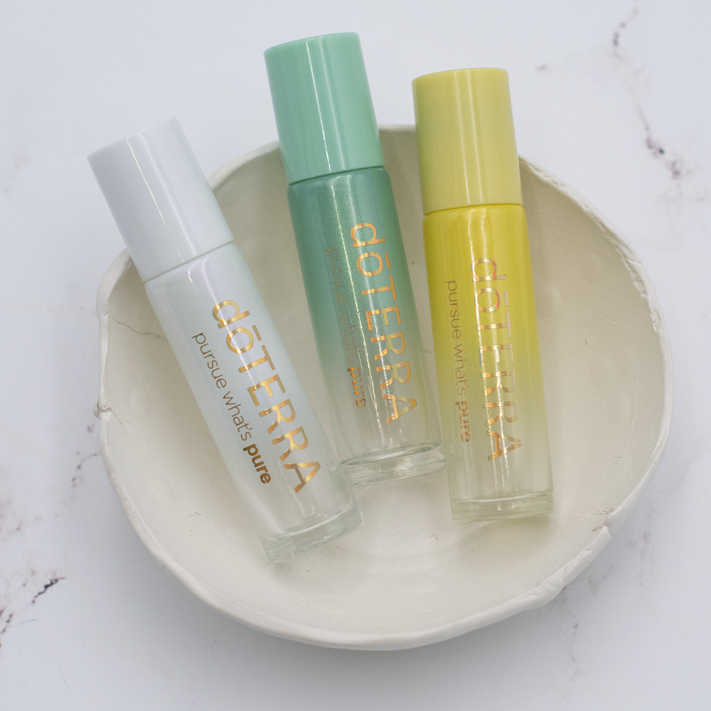 Zestaw trzech, błyszczących butelek, inspirowanych kolorystyką wiosny z logo dōTERRA idealnie sprawdzą się aby przechowywać swoje indywidualne olejkowe mieszanki.