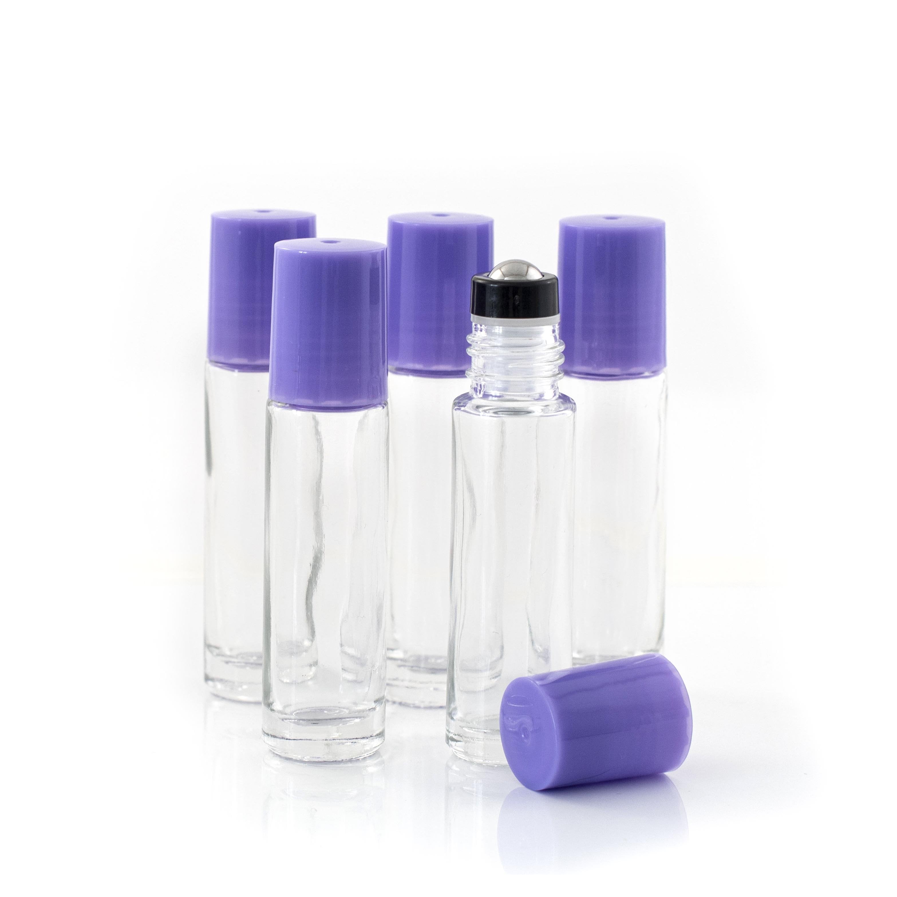 Butelka 10ml z przezroczystego szkła z fioletową, plastikową nakrętką i nasadką z kulką ze stali nierdzewnej - 5 szt. Idealnie nadają się przechowywania osobistych mieszanek, do wykorzystania podczas warsztatów lub jako podarunek.