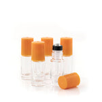Butelka 5ml z przezroczystego, grubego szkła z pomarańczową, plastikową nakrętką  i nasadką z kulką ze stali nierdzewnej - 5 szt. Idealnie nadają się przechowywania osobistych mieszanek, do wykorzystania podczas warsztatów lub jako podarunek.