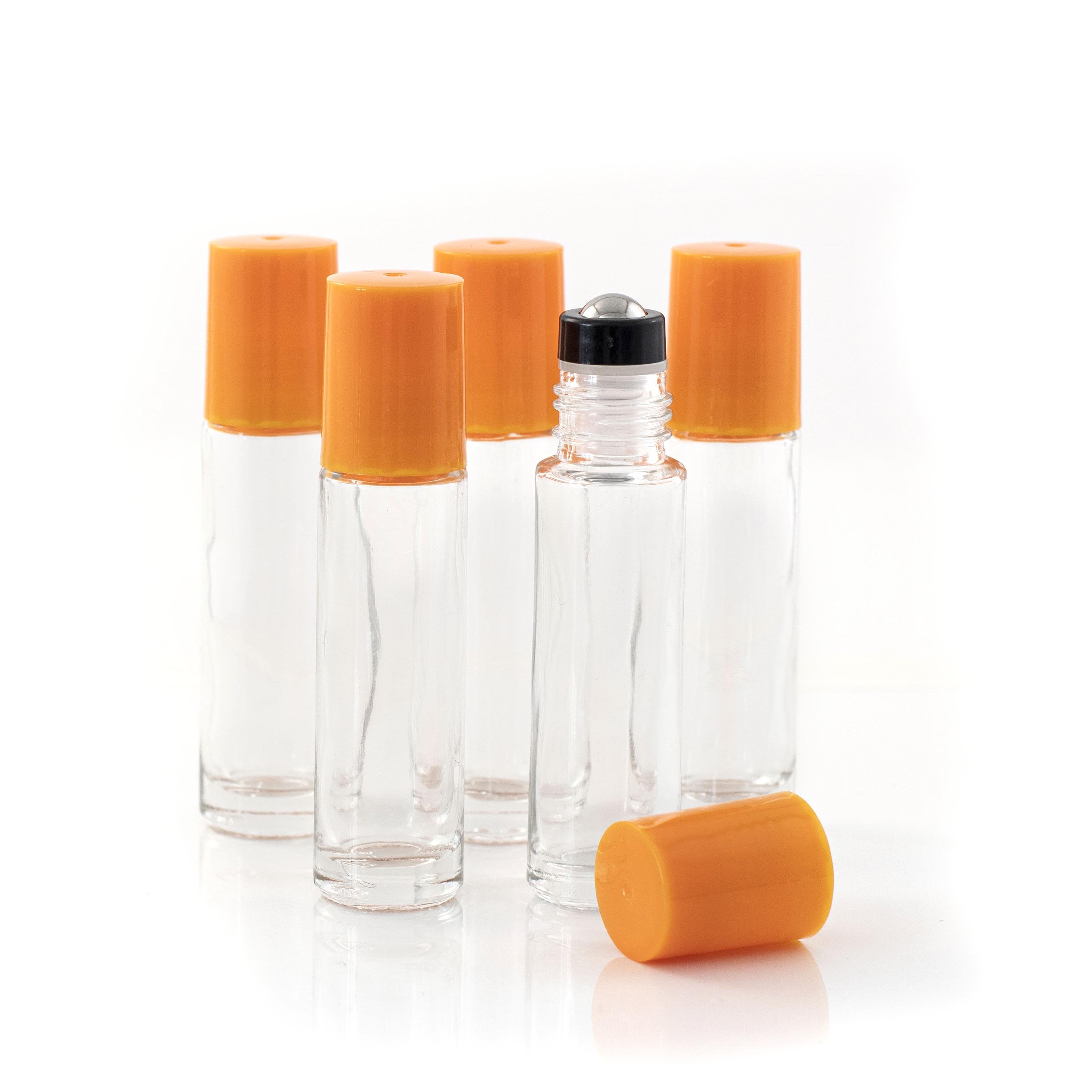 Butelka 10ml z przezroczystego szkła z pomarańczową, plastikową nakrętką i nasadką z kulką ze stali nierdzewnej - 5 szt. Idealnie nadają się przechowywania osobistych mieszanek, do wykorzystania podczas warsztatów lub jako podarunek.