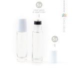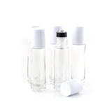 Butelka 10ml z przezroczystego szkła z białą, plastikową nakrętką i nasadką z kulką ze stali nierdzewnej - 5 szt. Idealnie nadają się przechowywania osobistych mieszanek, do wykorzystania podczas warsztatów lub jako podarunek.