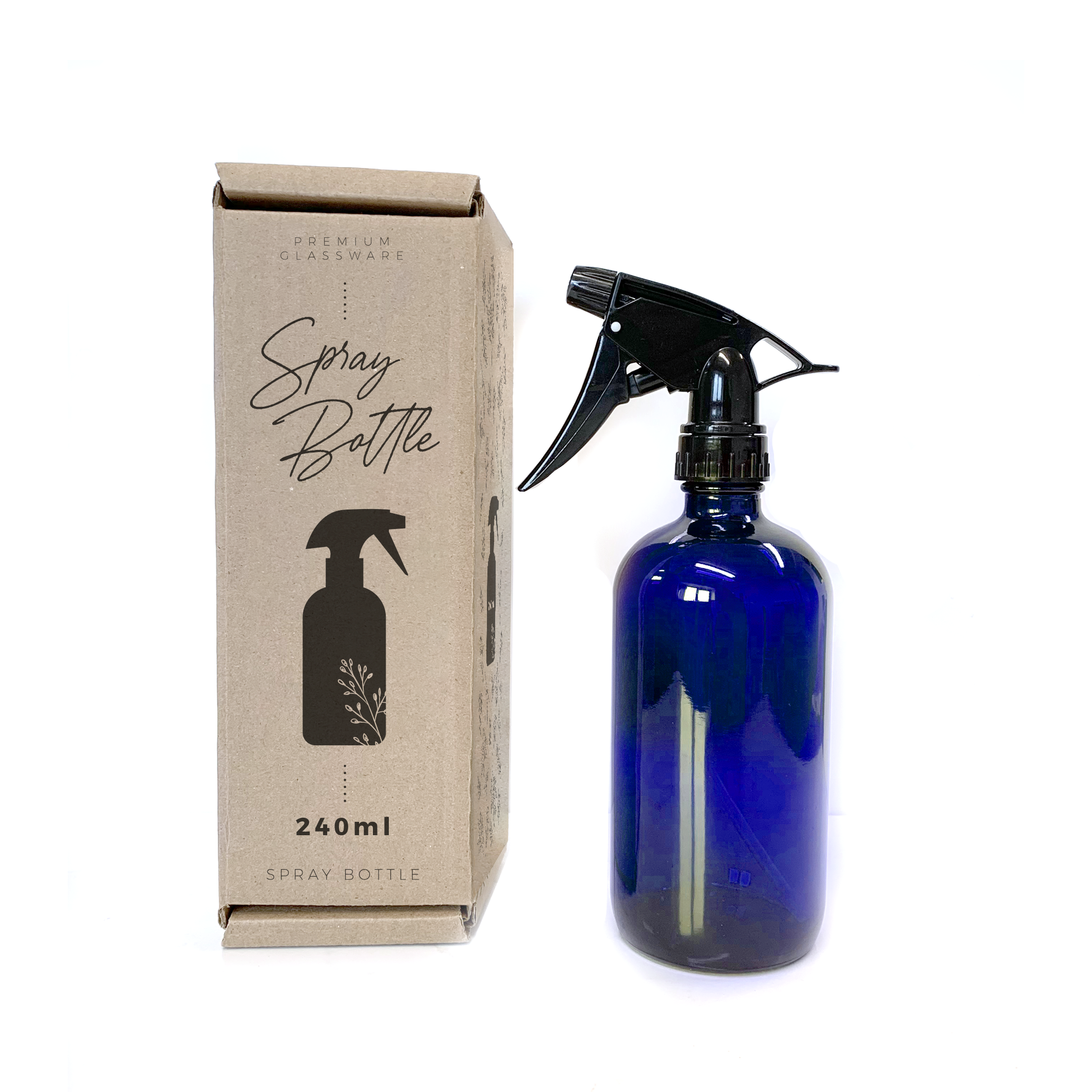 Zawartość: 1 x 240 ml niebieska butelka z rozpylaczem z czarną głowicą spustową spray, 2 białe dekoracyjne naklejki winylowe i arkusz z przepisami w j. angielskim