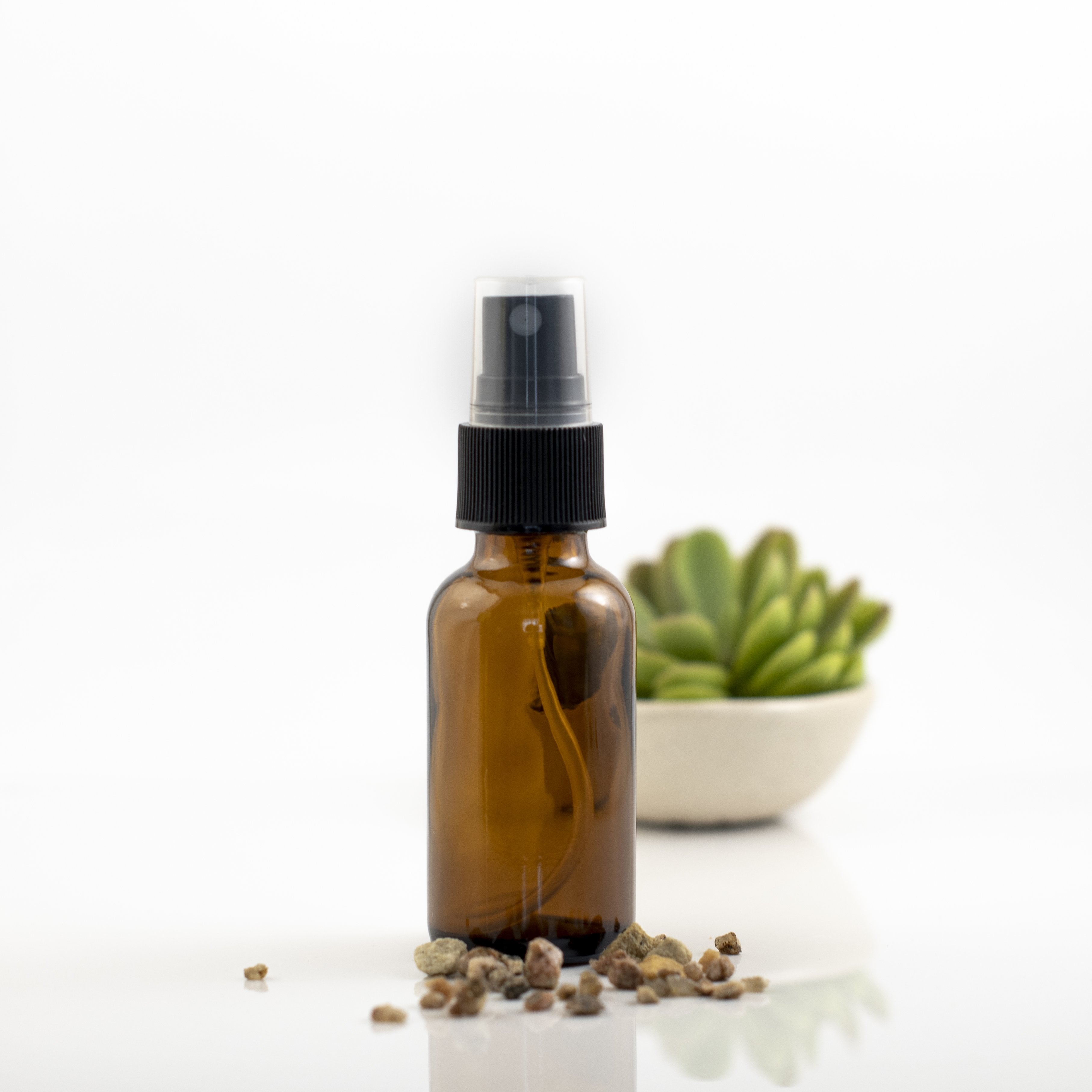 Butelka z bursztynowego szkła o pojemności 30ml jest wyposażona w czarną głowicę rozpylającą z pompką i przezroczystą plastikową nakrętkę dla ochrony nasadki.
