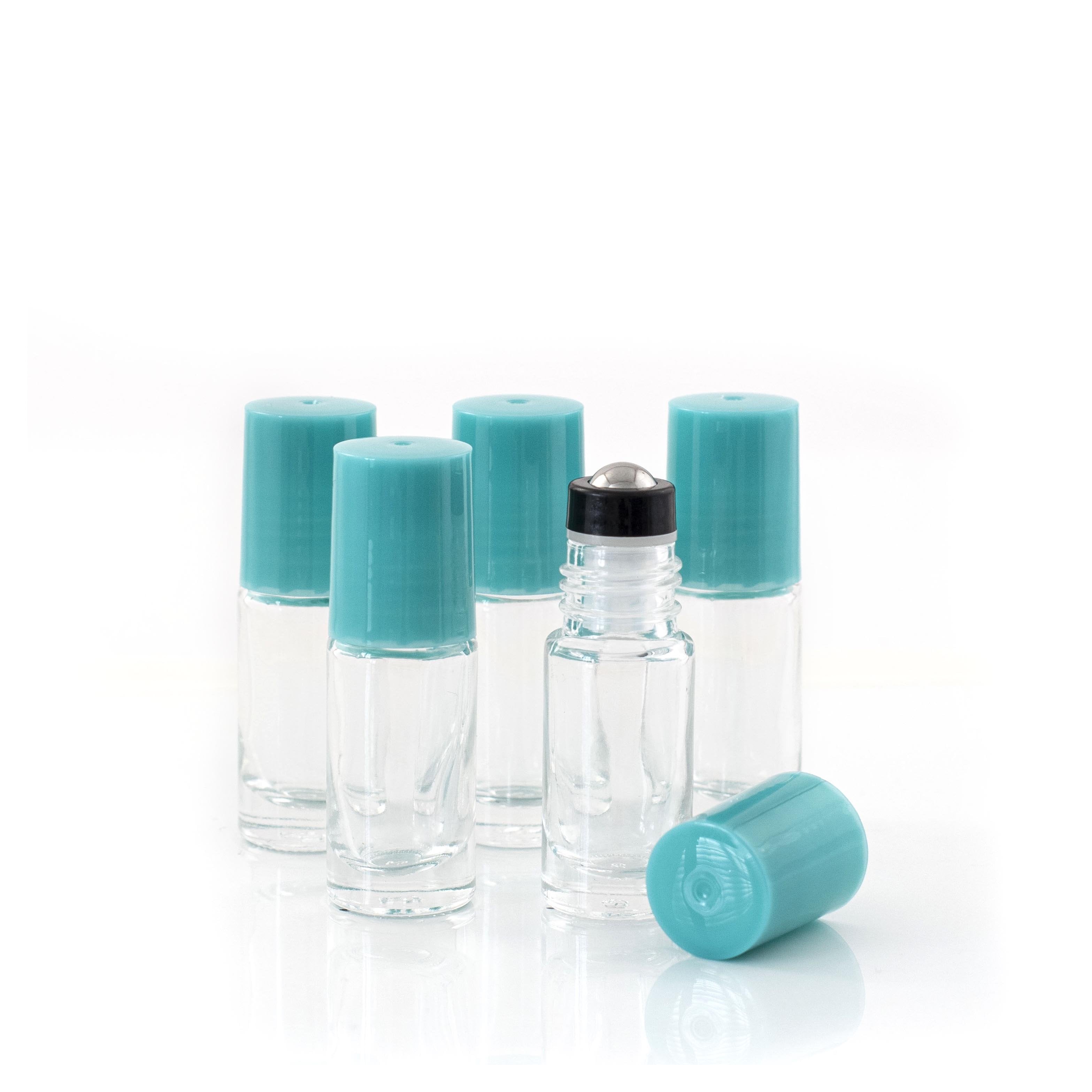 Butelka 5ml z przezroczystego, grubego szkła z morską, plastikową nakrętką i nasadką z kulką ze stali nierdzewnej - 5 szt. Idealnie nadają się przechowywania osobistych mieszanek, do wykorzystania podczas warsztatów lub jako podarunek.
