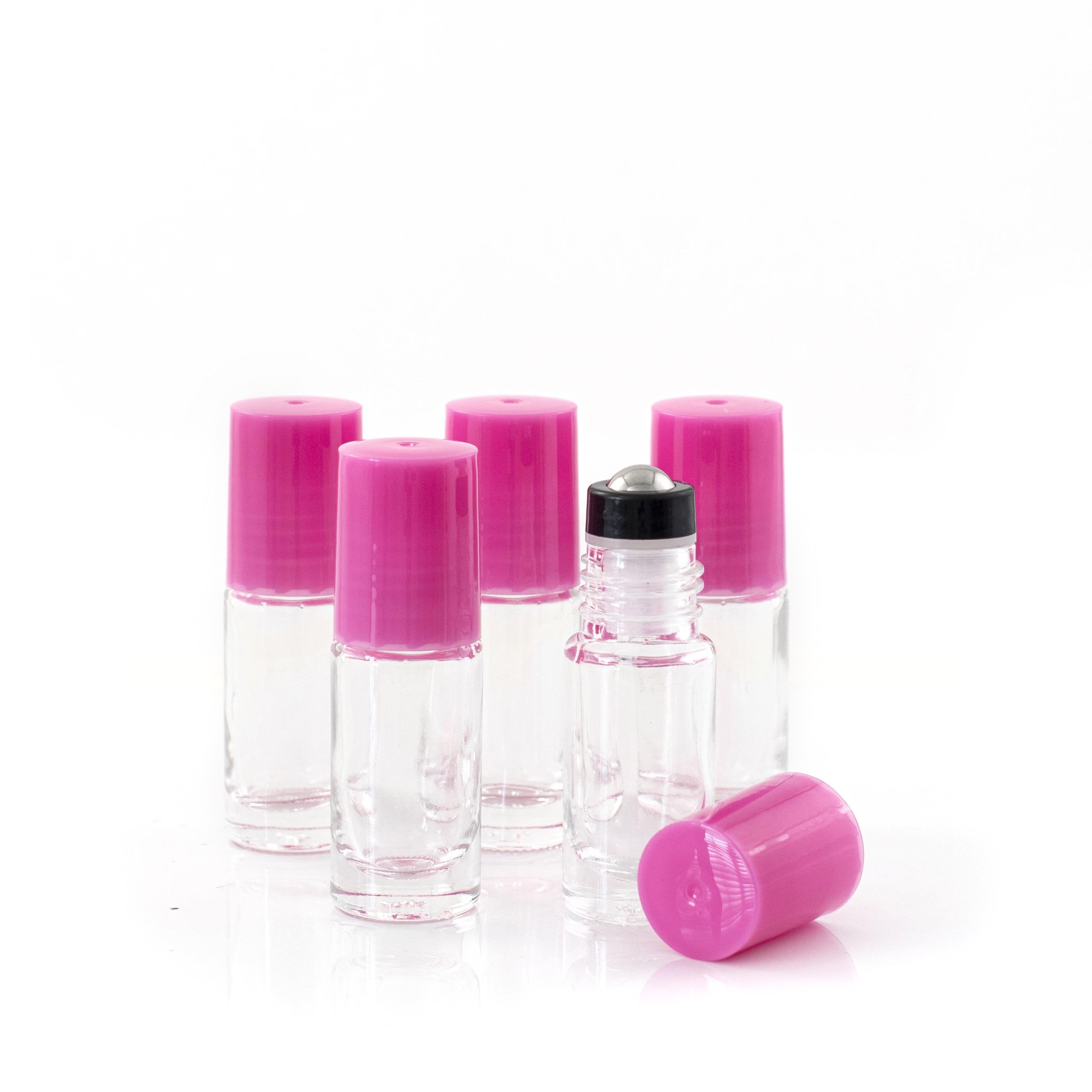 Butelka 5ml z przezroczystego, grubego szkła z różową, plastikową nakrętką i nasadką z kulką ze stali nierdzewnej - 5 szt. Idealnie nadają się przechowywania osobistych mieszanek, do wykorzystania podczas warsztatów lub jako podarunek.