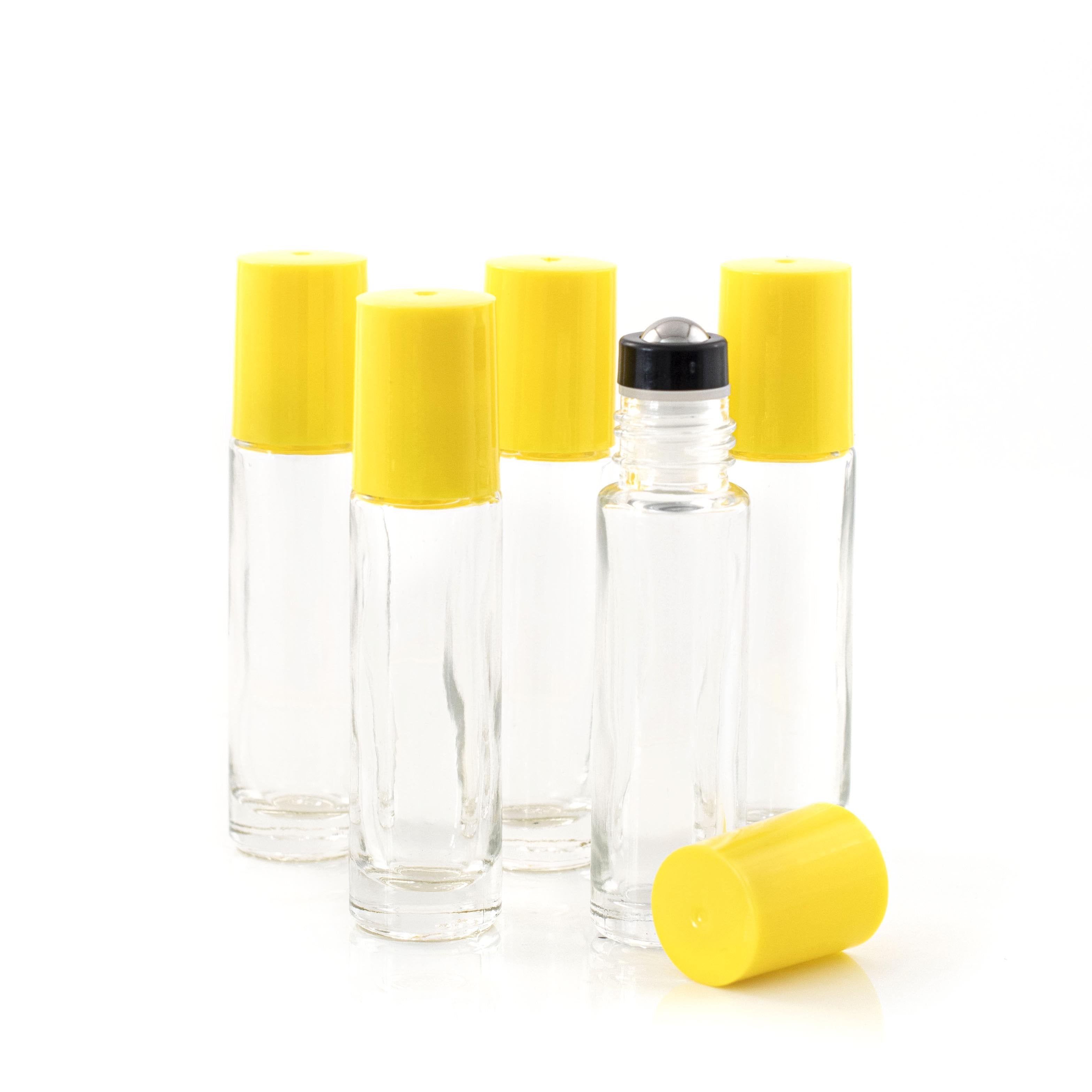 Butelka 10ml z przezroczystego szkła z żółtą, plastikową nakrętką i nasadką z kulką ze stali nierdzewnej - 5 szt. Idealnie nadają się przechowywania osobistych mieszanek, do wykorzystania podczas warsztatów lub jako podarunek.