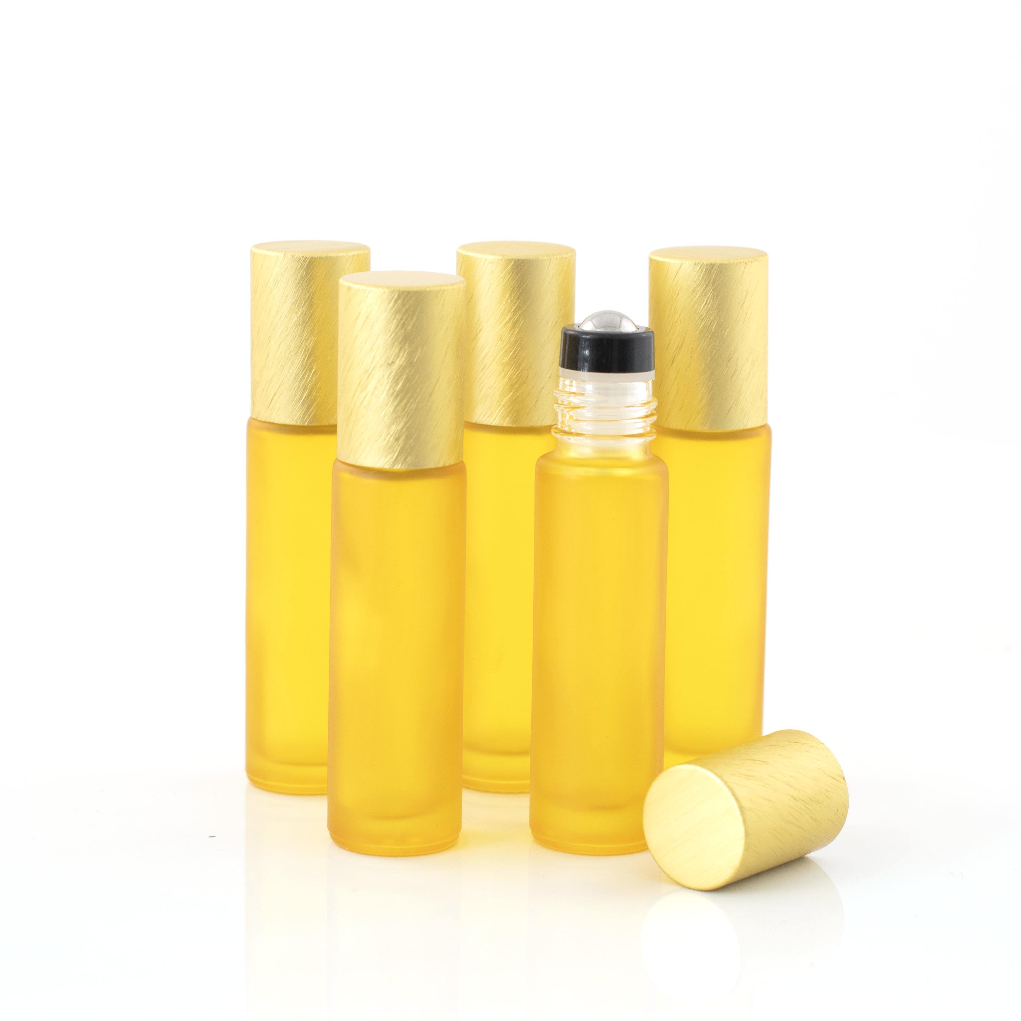 10ml szklana żółta butelka z efektem szronu z nasadką z kulką ze stali nierdzewnej i złotą metalową nakrętką (5szt.)
