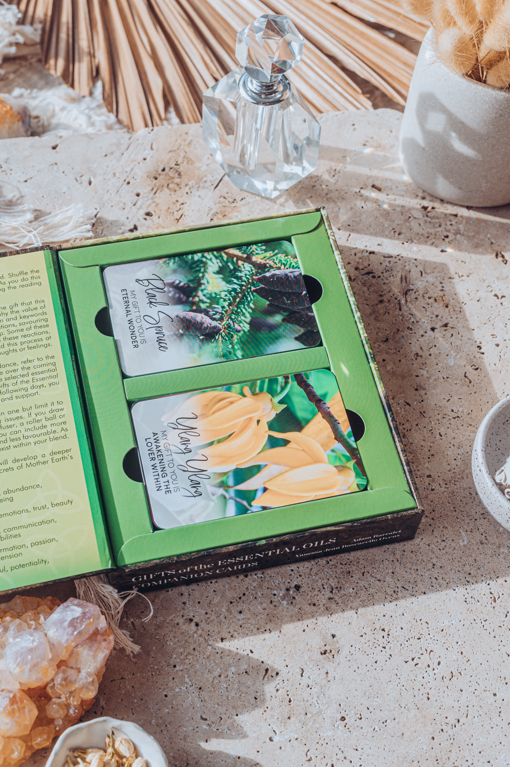 Każda dwustronna karta zawiera kolorowe zdjęcie olejku eterycznego wraz z towarzyszącymi słowami kluczowymi, afirmacją i symbolem żywiołu oraz darem.