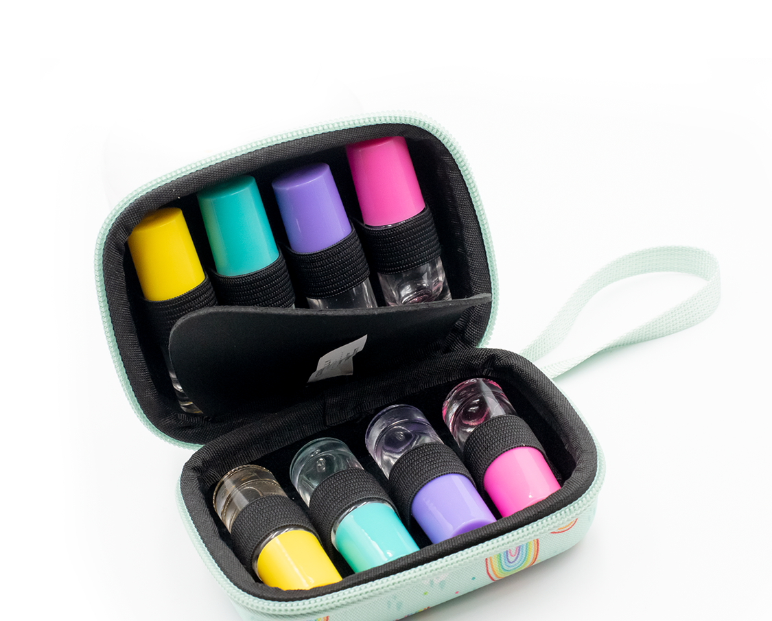 Ten twardy futerał jest wykonany z najwyższej jakości materiałów, aby zapewnić bezpieczeństwo i ochronę Twoich cennych „kropli złota”. Jest idealnie dopasowany, aby pomieścić 8 butelek o pojemności 5 ml zawierających ulubione mieszanki wspierające na cały dzień, a dopasowany kolorystycznie pasek na nadgarstek ułatwia trzymanie, gdy trzeba wybrać butelkę w drodze, lub ułatwia obsługę w przypadku dzieci.