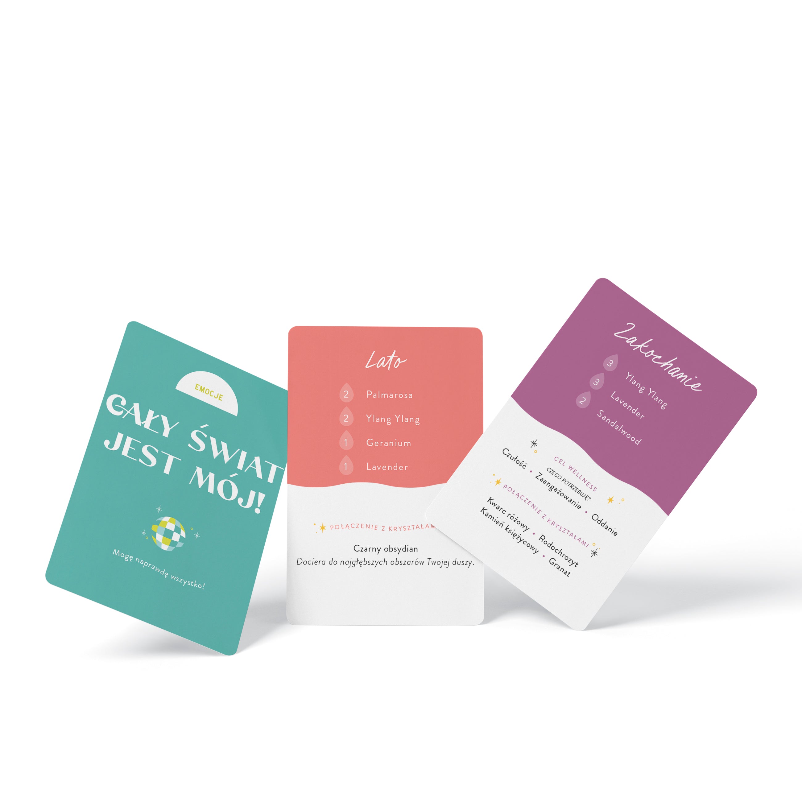 Możesz wybrać karty losowo lub według własnych potrzeb. Co więcej, możesz wykorzystać przepisy do swoich buteleczek z kulką! Do mieszanki dodaj olej bazowy a ilość kropli dostosuj do swoich potrzeb i preferencji.