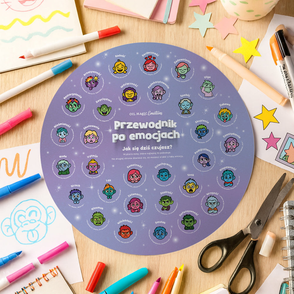Zawartość: 1 x Laminowana okrągła karta, koło, Przewodnik po Emocjach dla Dzieci (Wyszukiwarka Uczuć) j.polski