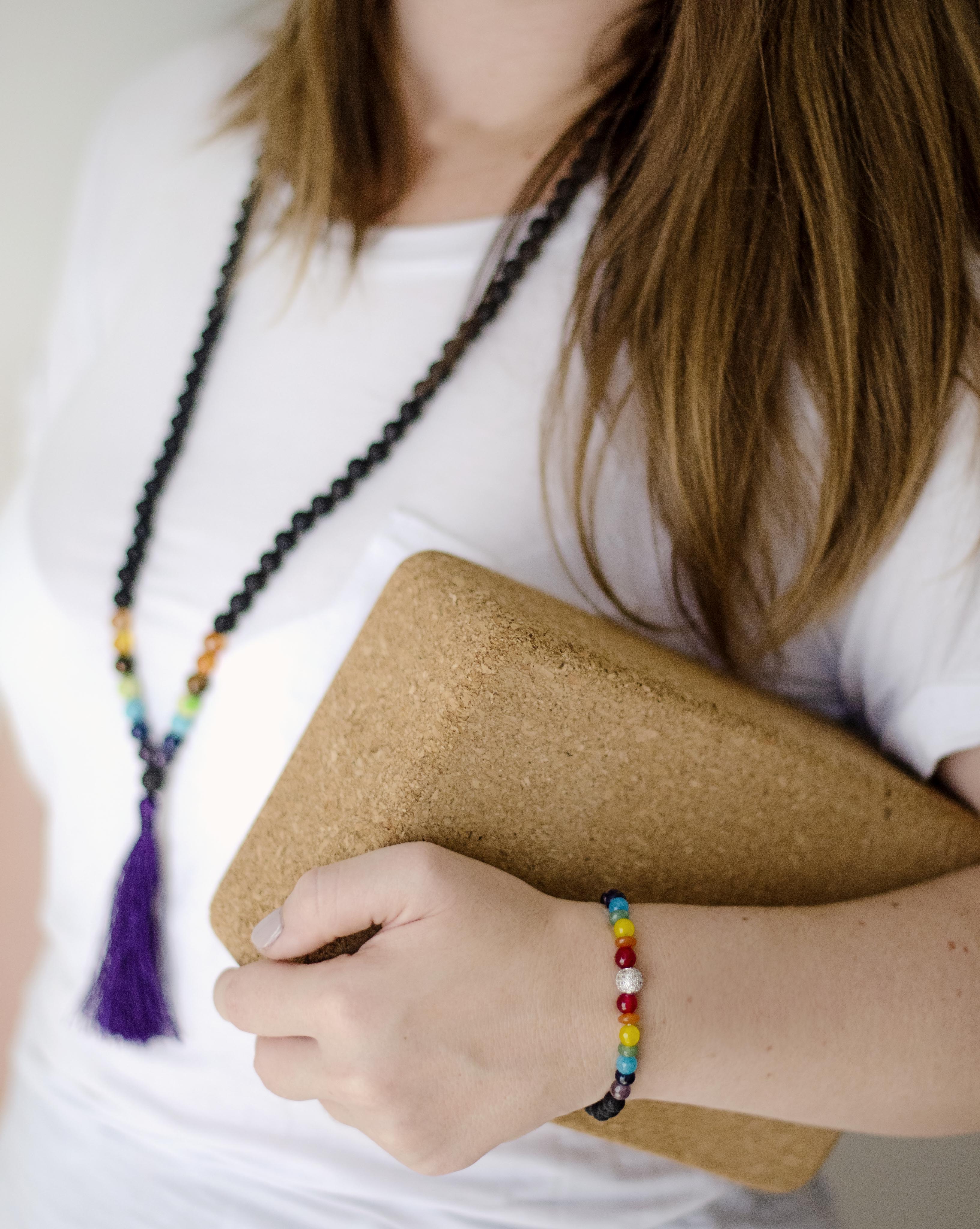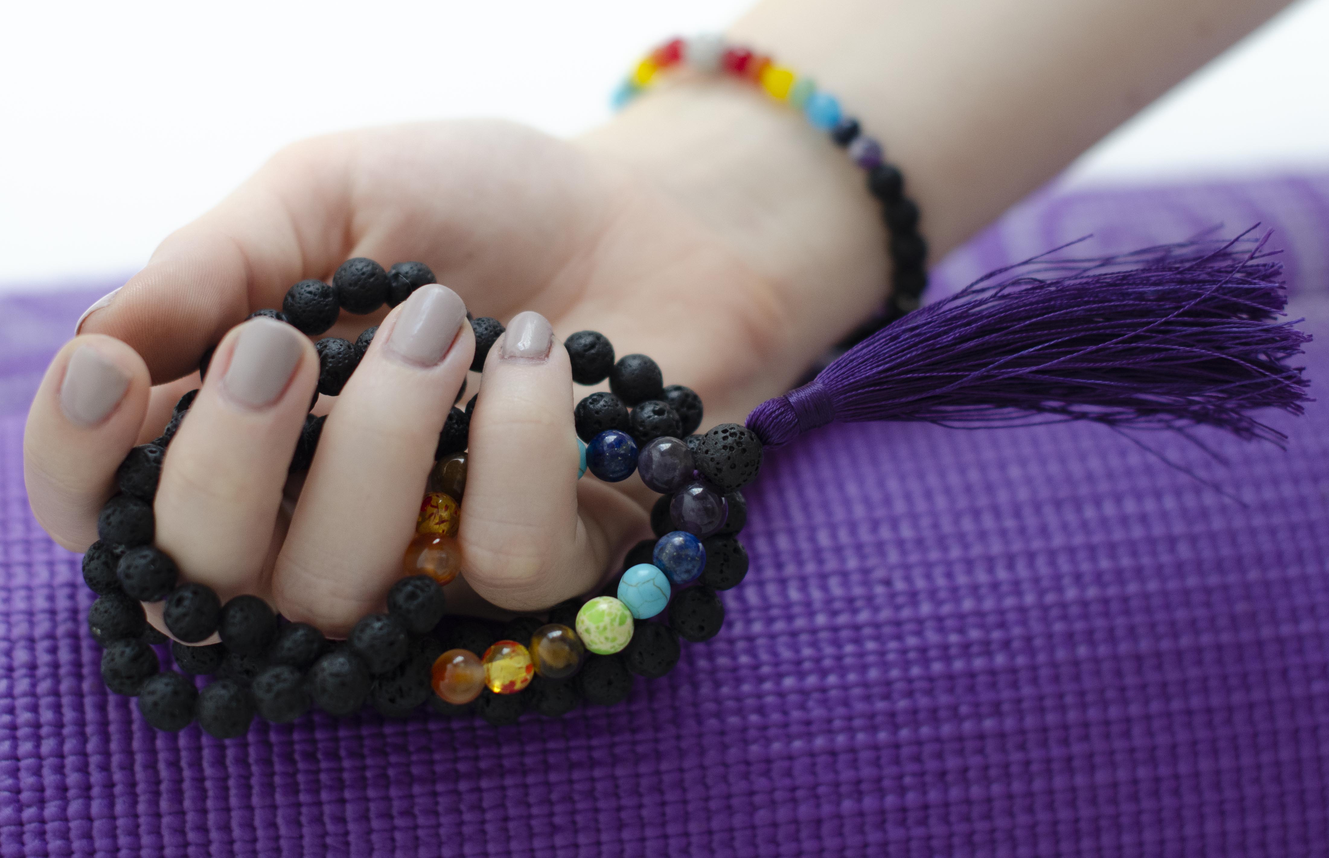 Naszyjnik z lawy wulkanicznej (mala) posiada również kamienie szlachetne dedykowane czakrą oraz ozdobny fioletowy chwost.