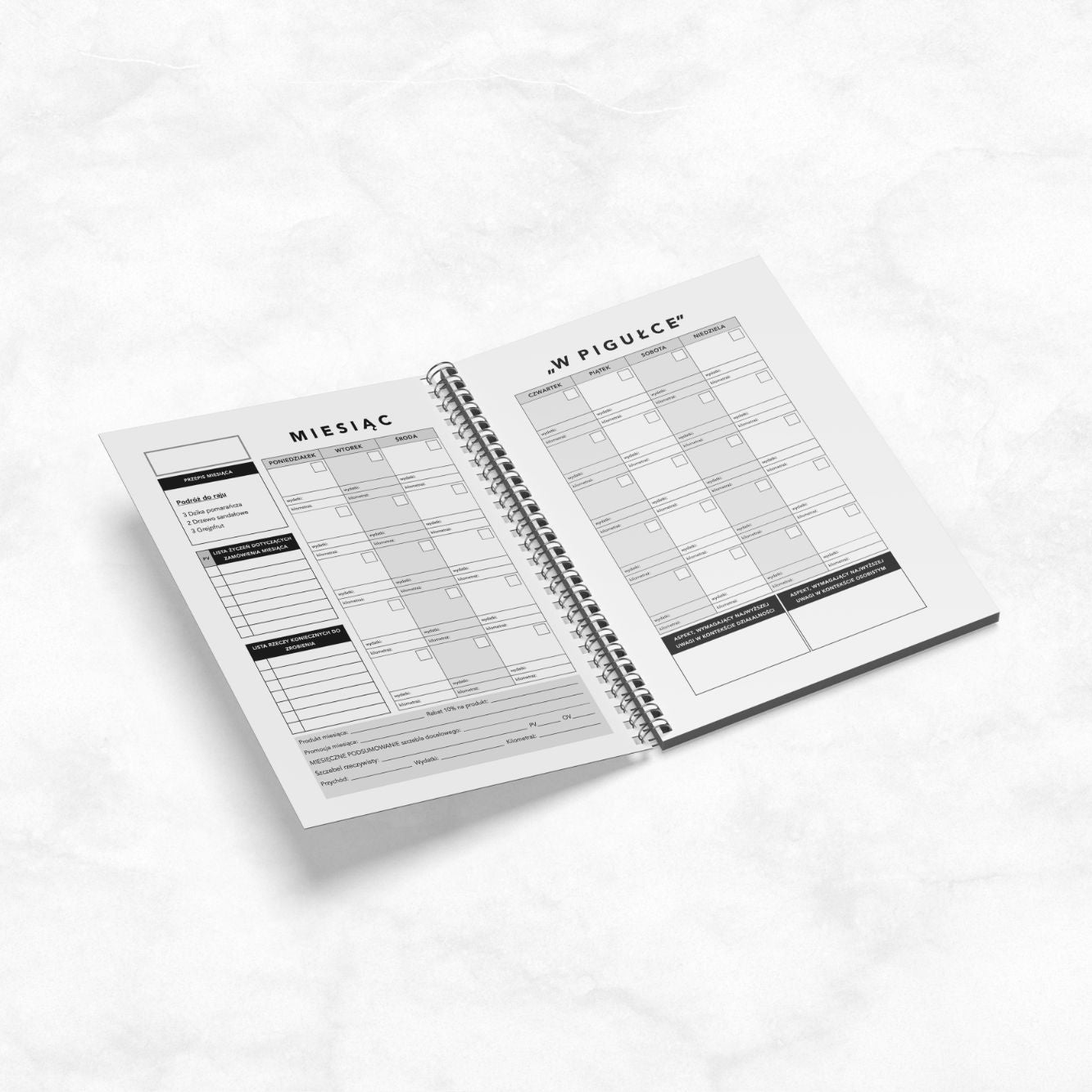 * Tygodniowy niedatowany kalendarz, z tygodniowym miejscem na pisanie intencji